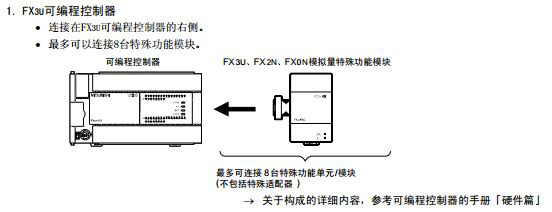 下面的圖片是小編從三菱FX3U系列PLC用戶手冊(硬件篇)上截下來的,都是一些關于三菱FX3U系列PLC連接三菱PLC擴展模塊的說明以及方法!