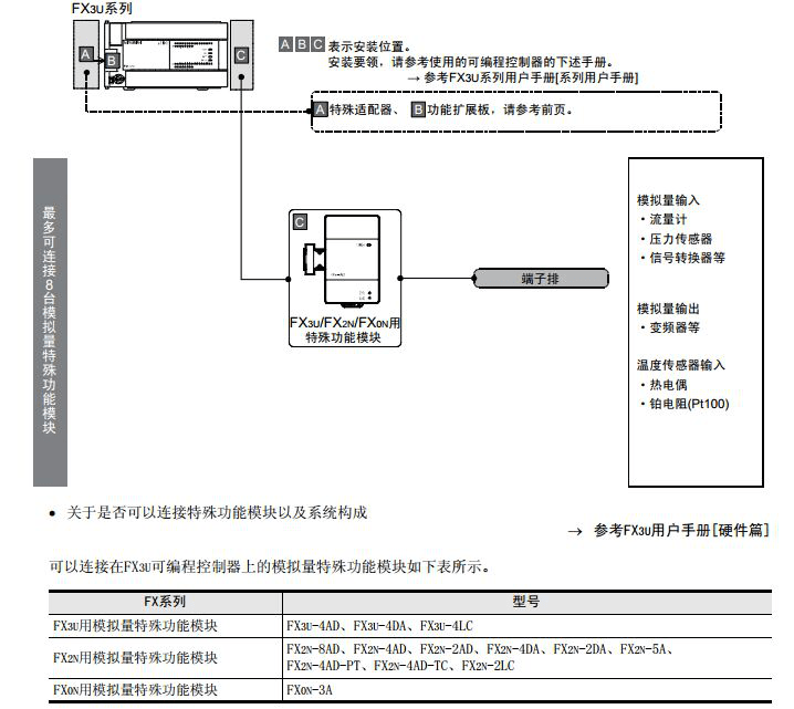 據小編了解,三菱FX3U系列PLC最多可以連接4臺三菱PLC模擬量特殊適配器,最多可以連接8臺三菱PLC特殊功能模塊。