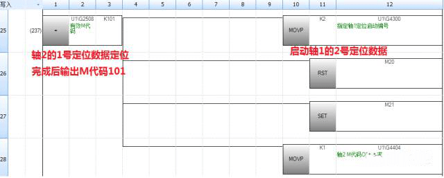 其次,在定位數據的最后一列,就是設置M代碼的地方,每一個定位數據都可以設置一個M代碼,M代碼可以在1-65535中任意設置一個整數(設為0則表示不使用),同一軸的定位數據里,M代碼不要設為一樣,不同軸之間則無所謂比如,在本例中,軸1定位數據1M代碼設置為100,定位數據2M代碼設置為102。 為了在程序中不混淆,軸2定位數據1M代碼設置為101