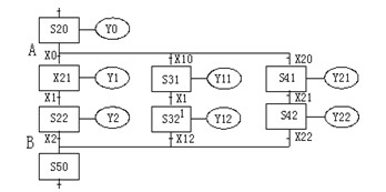 該狀態(tài)轉(zhuǎn)移圖有三個(gè)流程圖,S20為分支狀態(tài) ,根據(jù)不同的條件( X0,X10,X20), 選擇執(zhí)行其中一個(gè)條件滿足的流程。 X0,X10,X20不能同時(shí)為ON,S50為匯合狀態(tài),可由S22、S32、S42任一狀態(tài)驅(qū)動(dòng)。